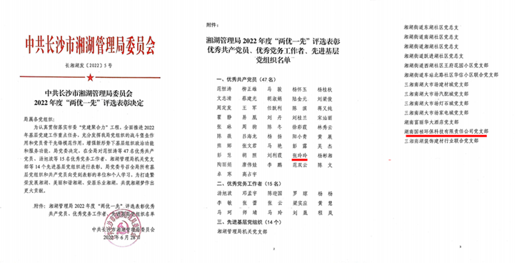 6月30日上午,中節(jié)能國禎湖南國禎環(huán)??萍加邢挢熑喂军h支部榮獲中共長沙市湘湖管理局委員會授予的“先進基層黨組織”,支部黨務(wù)工作專干張玲玲同志被評為“優(yōu)秀共產(chǎn)黨員”。湖南區(qū)域公司總經(jīng)理崔黎明受邀為“先進基層黨組織”代表頒獎。 中節(jié)能國禎湖南區(qū)域黨支部自2018年成立以來,按照上級黨委“五化”建設(shè)的要求,增強“四個意識”、堅定“四個自信”、做到“兩個維護”。積極提升支部黨建工作水平,積極開展黨員思想政治學習,積極做好“不忘初心、牢記使命”主題教育,支部工作主要從強黨建,凝隊伍;樹形象,固堡壘;學思想,樹理念;爭先鋒、做服務(wù)等幾個方面落實,推進黨建工作與生產(chǎn)經(jīng)營同頻共振、互融共進,充分發(fā)揮黨組織的政治核心作用、戰(zhàn)斗保壘作用和黨員的先鋒模范作用。 榮譽的取得,既是鼓勵,也是鞭策。中節(jié)能國禎湖南區(qū)域黨支部將不斷強化黨建引領(lǐng),形成黨建聚合力,帶領(lǐng)黨員群眾續(xù)繼開拓創(chuàng)新、努力工作,發(fā)揮黨建實質(zhì)作用,不斷增強黨支部在企業(yè)中的滲透力,影響力和覆蓋面。全體黨員定會牢記初心使命、勇于擔當作為、堅定理想信念、努力拼搏進取,為推動公司高質(zhì)量發(fā)展的進程中凝聚昂揚向上力量,以實際行動迎接黨的二十大勝利召開。