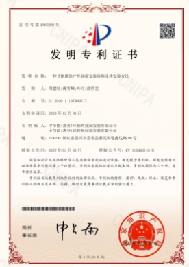 近日,中節(jié)能實業(yè)發(fā)展有限公司下屬嘉興公司自主申報的《一種節(jié)能建筑戶外地板安裝結構及其按照方法》的技術成果通過國家知識產(chǎn)權局審查,被授予發(fā)明專利權。