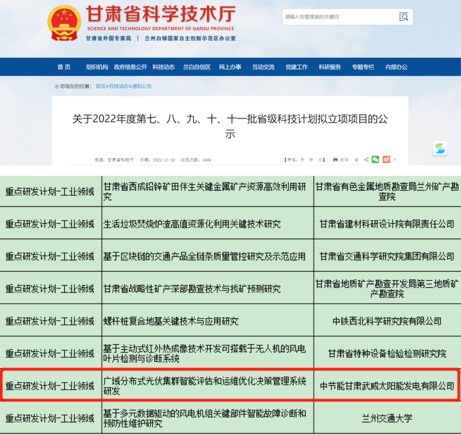 12月19日,甘肅省科技廳發(fā)布了2022年度省級(jí)科技計(jì)劃立項(xiàng)公示,太陽能公司下屬西北區(qū)武威公司承擔(dān)的《廣域分布式光伏集群智能評(píng)估和運(yùn)維優(yōu)化決策管理系統(tǒng)研發(fā)》項(xiàng)目成功入圍,在省級(jí)科技項(xiàng)目上實(shí)現(xiàn)新突破。