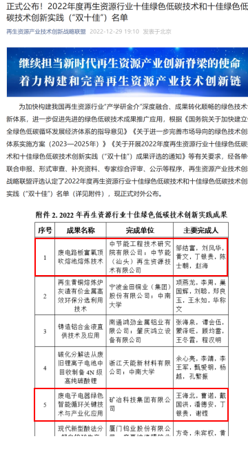 2022年12月29日,再生資源產業(yè)技術創(chuàng)新戰(zhàn)略聯盟正式公布了2022年度再生資源行業(yè)十佳綠色低碳技術和十佳綠色低碳技術創(chuàng)新實踐(“雙十佳”)名單。經評選認定、公示等程序,中研院牽頭完成的“廢電路板富氧頂吹熔池熔煉技術”、參與完成的“廢電子電器綠色智能循環(huán)關鍵技術與產業(yè)化應用”共兩項技術榮獲2022年度再生資源行業(yè)十佳綠色低碳技術創(chuàng)新實踐成果獎。