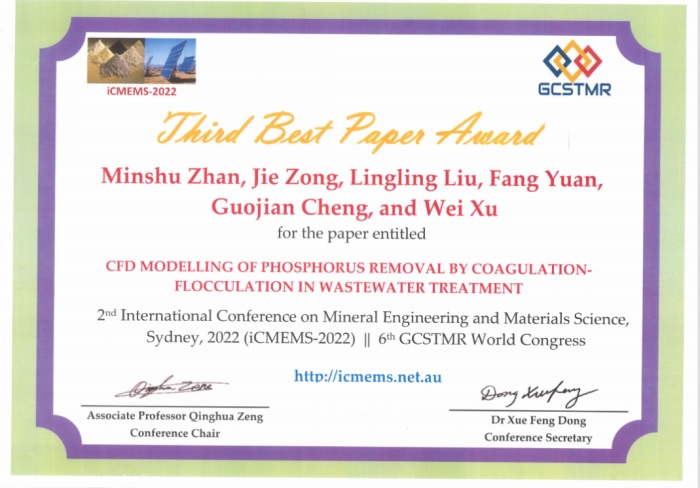 近日,基于公司牽頭承擔(dān)的集團(tuán)公司2019年度重大科技創(chuàng)新項(xiàng)目《污水處理新型藥劑開(kāi)發(fā)及投加量?jī)?yōu)化控制研究與示范》的“除磷藥劑智能投加系統(tǒng)”技術(shù)成果完成的《CFD Modelling of Phosphorus Removal by Coagulation-Flocculation in Wastewater Treatment 》論文在第2屆礦物工程與材料科學(xué)國(guó)際會(huì)議(The 2nd International Conference on Mineral Engineering and Materials Science, 簡(jiǎn)稱iCMEMS-2022)上獲評(píng)優(yōu)秀論文(三等獎(jiǎng))。