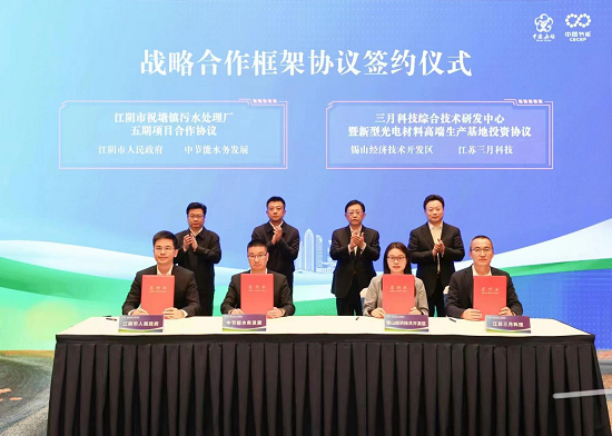 簽約儀式上,中節(jié)能水務(wù)發(fā)展有限公司和江陰市政府簽訂城鎮(zhèn)污水處理合作協(xié)議,江蘇三月科技股份有限公司和錫山區(qū)政府簽訂新型光電材料高端生產(chǎn)基地建設(shè)項(xiàng)目合作協(xié)議,中節(jié)能鐵漢生態(tài)環(huán)境股份有限公司和無錫市環(huán)保集團(tuán)有限公司簽訂戰(zhàn)略合作框架協(xié)議,中節(jié)能節(jié)能科技東南分公司和中國移動通信集團(tuán)江蘇有限公司無錫分公司簽訂機(jī)房余熱回收利用項(xiàng)目合作協(xié)議。