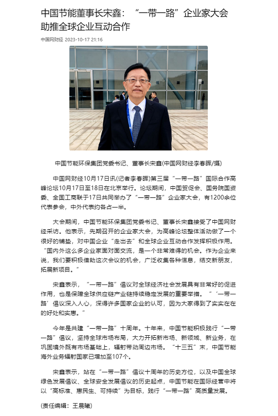 參加論壇期間,宋鑫接受《中國(guó)網(wǎng)財(cái)經(jīng)》采訪時(shí)表示,“一帶一路”倡議對(duì)全球經(jīng)濟(jì)社會(huì)發(fā)展具有非常好的促進(jìn)作用,也是保障全球供應(yīng)鏈產(chǎn)業(yè)鏈持續(xù)穩(wěn)定發(fā)展的重要舉措。中國(guó)節(jié)能站在“一帶一路”倡議十周年的歷史方位,以及中國(guó)全球綠色發(fā)展倡議、全球安全發(fā)展倡議的歷史起點(diǎn),將積極踐行“一帶一路”倡議,堅(jiān)持全球市場(chǎng)布局,大力開(kāi)拓新市場(chǎng)、新領(lǐng)域、新業(yè)務(wù),在鞏固境外既有市場(chǎng)基礎(chǔ)上,輻射帶動(dòng)周邊市場(chǎng),以“高標(biāo)準(zhǔn)、惠民生、可持續(xù)”為目標(biāo),踐行“一帶一路”高質(zhì)量發(fā)展。
