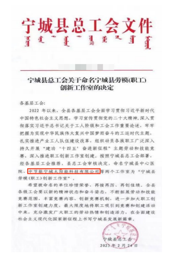 近日,寧城縣總工會舉行授牌表彰儀式,太陽能西中區(qū)寧城電站職工創(chuàng)新工作室被內(nèi)蒙古赤峰市寧城縣總工會命名為“職工創(chuàng)新工作室”。