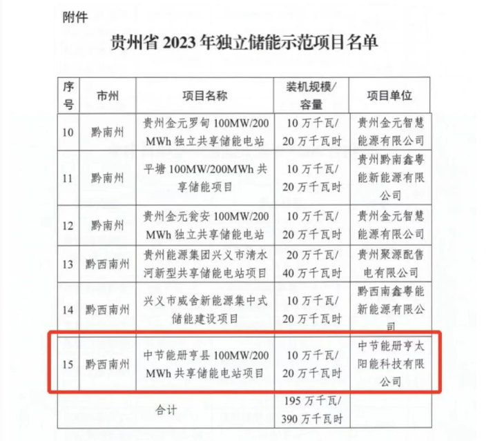 近日,貴州省能源局、貴州省發(fā)展和改革委員會(huì)聯(lián)合發(fā)布了《貴州省2023年獨(dú)立儲(chǔ)能示范項(xiàng)目建設(shè)有關(guān)工作的通知》(以下簡(jiǎn)稱(chēng)通知),其中公開(kāi)發(fā)布15個(gè)獨(dú)立儲(chǔ)能示范項(xiàng)目,并給予其相應(yīng)政策支持,總規(guī)模共計(jì)1950MW/3900MWh,太陽(yáng)能公司華南區(qū)下屬中節(jié)能冊(cè)亨100MW/200MWh共享儲(chǔ)能電站項(xiàng)目成功入選。
