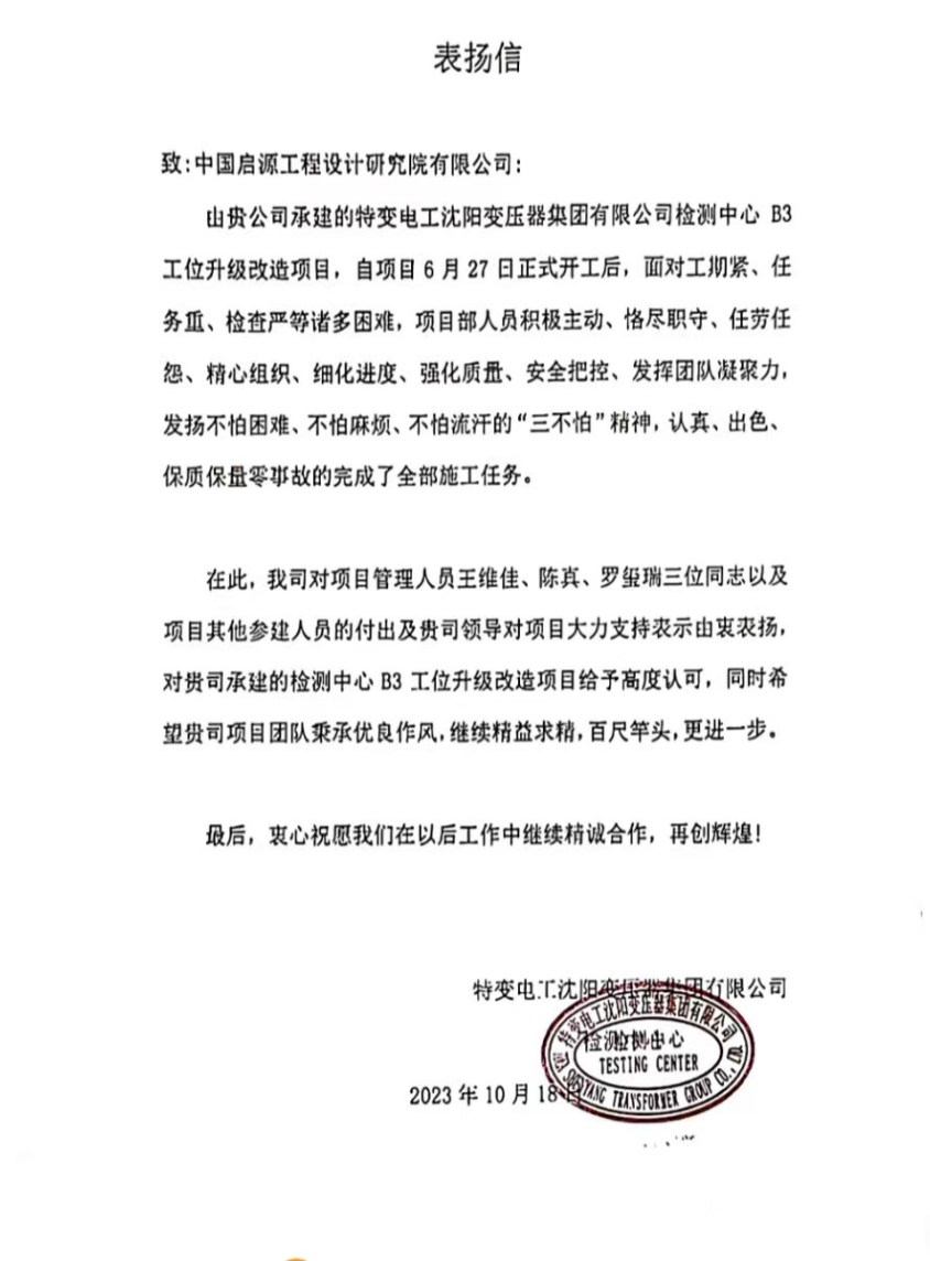 近日,中國啟源所屬啟源設(shè)計負責(zé)的特變電工沈陽變壓器集團有限公司檢測中心B3工位升級改造EPC總承包項目通過竣工驗收,并收到了沈變公司發(fā)來的表揚信。