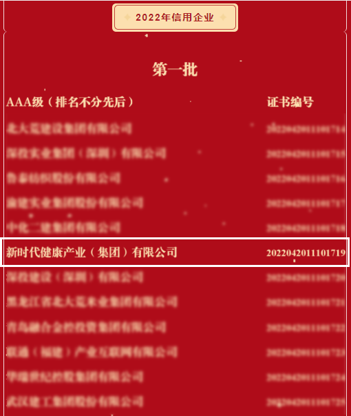 近日,在中國企業(yè)聯(lián)合會、中國企業(yè)家協(xié)會(簡稱“中國企聯(lián)”)發(fā)布的2022年信用企業(yè)名單中,健康產(chǎn)業(yè)公司成功榮登信用企業(yè)最高AAA級榜單。