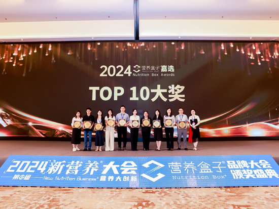 6月5日,“營養(yǎng)大創(chuàng)新”2024年第十二屆新營養(yǎng)大會暨“營養(yǎng)盒子”頒獎盛典在杭州召開,健康產業(yè)公司丹鳳水光臻TM雙肽風味飲品榮獲“2024營養(yǎng)盒子嘉選?TOP10大獎”。