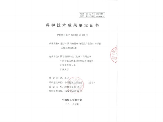 此次成果鑒定會由中國輕工業(yè)聯(lián)合會組織。中華中醫(yī)藥學會、中國醫(yī)學科學院藥用植物資源研究所、清華大學附屬北京清華長庚醫(yī)院、中國農業(yè)大學、中國農業(yè)科學院等不同研究領域的專家出席會議并對《基于中國瑪咖性味歸經的產品創(chuàng)制與評價關鍵技術及應用》科學技術成果給予高度評價,認為該項目達到了國際領先技術水平。 此項成果由健康產業(yè)公司子公司國珍健康科技(北京)有限公司、中國食品發(fā)酵工業(yè)研究院、北京中醫(yī)藥大學、江南大學四家科研單位共同完成。獲得此項殊榮表明,健康產業(yè)公司在推動瑪咖“中藥化”過程中做出了突出的貢獻,賦予了瑪咖中藥藥性(甘、辛,微溫,歸腎、肝、脾經),明確了外來植物瑪咖的潛在功效(健脾益氣、補腎益精、疏肝解郁)及其物質基礎。健康產業(yè)公司依托瑪咖中藥藥性的研究成果,基于中藥方劑君臣佐使配伍理論,創(chuàng)制了多款瑪咖營養(yǎng)健康食品,取得了顯著的經濟和社會效益。