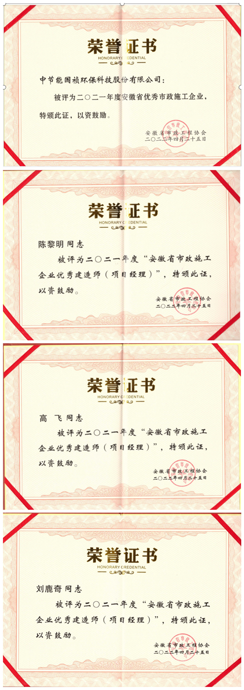 近日,中節(jié)能國禎獲評“2021年度安徽省優(yōu)秀市政施工企業(yè)”。公司陳黎明、劉鹿奇、高飛三位員工分別獲得“2021年度安徽省市政施工企業(yè)優(yōu)秀項目經(jīng)理”稱號。 “安徽省優(yōu)秀市政施工企業(yè)”稱號,作為安徽省市政工程行業(yè)企業(yè)管理中的最高榮譽,由安徽省市政工程協(xié)會組織,經(jīng)過對參評單位的經(jīng)營規(guī)模、經(jīng)濟效益、工程質量、安全管理、基礎管理、市場行為、科技進步等多方面進行綜合評估,旨在推動和鼓勵相關企業(yè)加強科學管理,提高經(jīng)濟效益和綜合實力,提高企業(yè)的資信和知名度,做大做強企業(yè)。 近年來,中節(jié)能國禎通過搭建工程建設管理體系,完善各事業(yè)部、子公司協(xié)同配合體系、落實安全檢查體系等各項措施,穩(wěn)扎穩(wěn)打,砥礪奮行,從“市級優(yōu)秀施工企業(yè)”到“省級優(yōu)秀施工企業(yè)”,從“黃山杯、廬州杯”優(yōu)秀企業(yè)再到“省級優(yōu)秀企業(yè)”,成績鼓舞人心,經(jīng)驗彌足珍貴。中節(jié)能國禎將始終秉承“讓天更藍、山更綠、水更清、讓生活更美好”的使命,立志在環(huán)保節(jié)能事業(yè)中再創(chuàng)佳績。