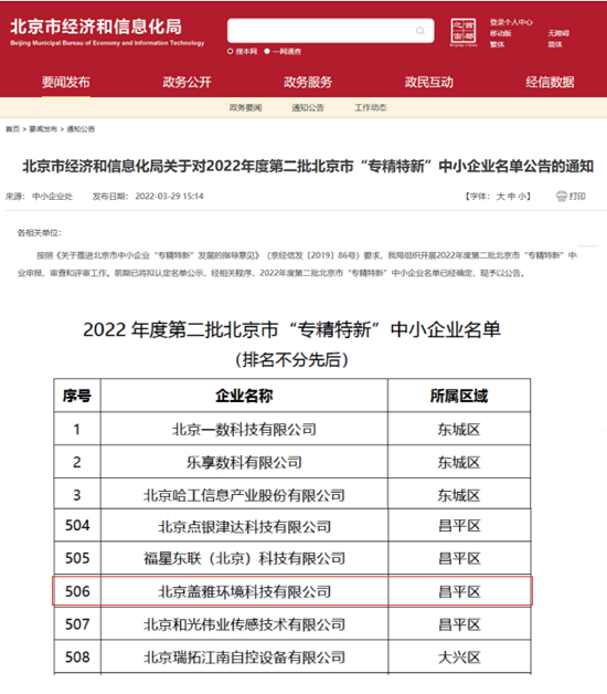 中節(jié)能鐵漢下屬蓋雅環(huán)境獲評北京市2022年度“專精特新”中小企業(yè) |