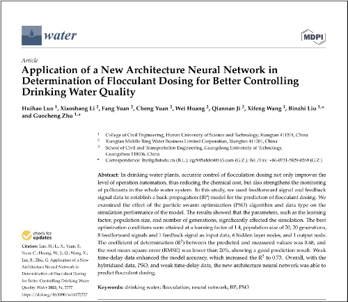 近日,中環(huán)水務(wù)下屬湘潭中環(huán)水務(wù)有限公司“自來(lái)水廠凈水系統(tǒng)中絮凝神經(jīng)網(wǎng)絡(luò)的構(gòu)建”項(xiàng)目研發(fā)團(tuán)隊(duì)的研究成果——題為《Application of a New Architecture Neural Network inDetermination of Flocculant Dosing for Better ControllingDrinking Water Quality》的學(xué)術(shù)論文在瑞士《Water》(影響因子3.530)期刊上正式發(fā)表。該研究團(tuán)隊(duì)的另一篇題為“Developing flocculation tensor to monitor water quality using deep learning model”的學(xué)術(shù)研究成果也即將在德國(guó)《Environmental Chemistry Letters》(環(huán)境化學(xué)快報(bào))(影響因子13.615)上刊登。這兩篇論文都將錄入SCI數(shù)據(jù)庫(kù)。