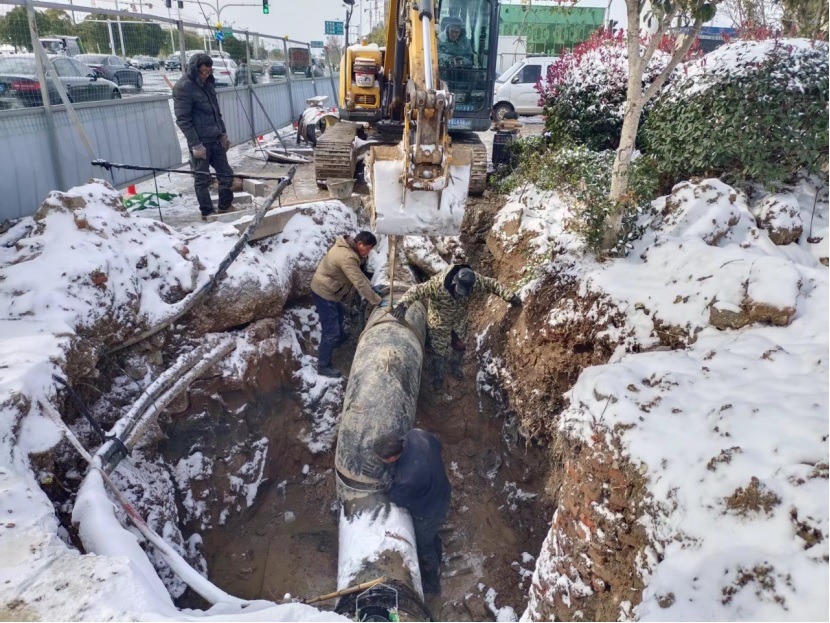 1月15日,蚌埠市懷遠(yuǎn)縣遭遇寒流襲擊,氣溫短時間內(nèi)驟降10℃,雪花紛飛,寒風(fēng)刺骨,但在禹王路與桓榮大道交叉口搶修現(xiàn)場的工作人員卻一刻也不敢停歇。由于路港公司在鋪設(shè)污水管道時將懷遠(yuǎn)中環(huán)位于地下9米的630PE主供水管網(wǎng)破壞,造成附近百戶居民無水可用。懷遠(yuǎn)中環(huán)公司第一時間啟用備用管網(wǎng),保障居民基本正常用水,一場搶修供水主管道的攻堅戰(zhàn)迅速打響。