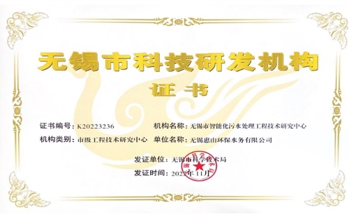 近日,中環(huán)水務(wù)下屬無錫惠山環(huán)保水務(wù)有限公司申報的市級工程技術(shù)研究中心,“無錫市智能化污水處理工程技術(shù)研究中心”正式取得無錫市科技局授予的科技研發(fā)機(jī)構(gòu)證書。