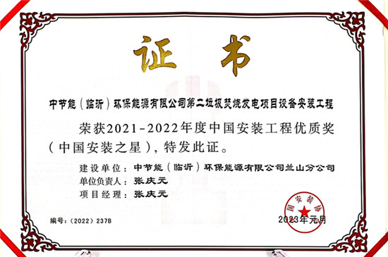 中國環(huán)保臨沂蘭山分公司垃圾焚燒發(fā)電項目榮獲“中國安裝之星” |