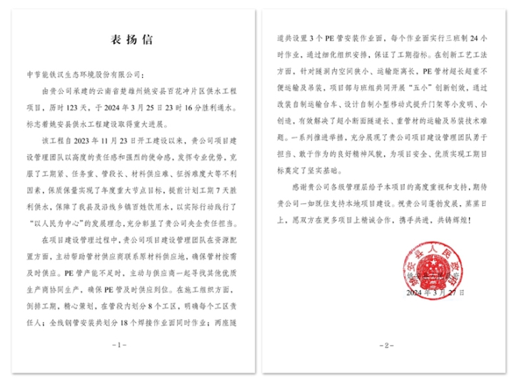 姚安縣人民政府專(zhuān)程發(fā)來(lái)《表?yè)P(yáng)信》,指出,項(xiàng)目自2023年11月23日開(kāi)工建設(shè)以來(lái),中節(jié)能鐵漢項(xiàng)目建設(shè)管理團(tuán)隊(duì)以高度的責(zé)任感和強(qiáng)烈的使命感,發(fā)揮專(zhuān)業(yè)優(yōu)勢(shì),克服了工期緊、任務(wù)重、管段長(zhǎng)、材料供應(yīng)難、征拆難度大等不利因素,保質(zhì)保量實(shí)現(xiàn)了年度重大節(jié)點(diǎn)目標(biāo)并提前7天供水,保障了姚安縣及沿線鄉(xiāng)鎮(zhèn)百姓飲用水,對(duì)助力當(dāng)?shù)剜l(xiāng)村振興具有重要作用,以實(shí)際行動(dòng)踐行了“以人民為中心”的發(fā)展理念,充分彰顯了央企責(zé)任擔(dān)當(dāng)。