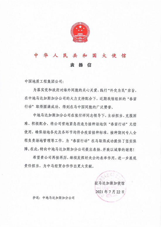 中國地質(zhì)收到中國駐馬達(dá)加斯加大使館表揚(yáng)信 |