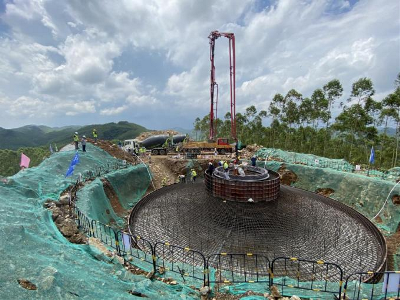 8月18日,經(jīng)過16個小時的緊張施工,風電廣西公司來賓忻城宿鄧低風速試驗風電場首臺風機基礎(chǔ)順利完成澆筑。