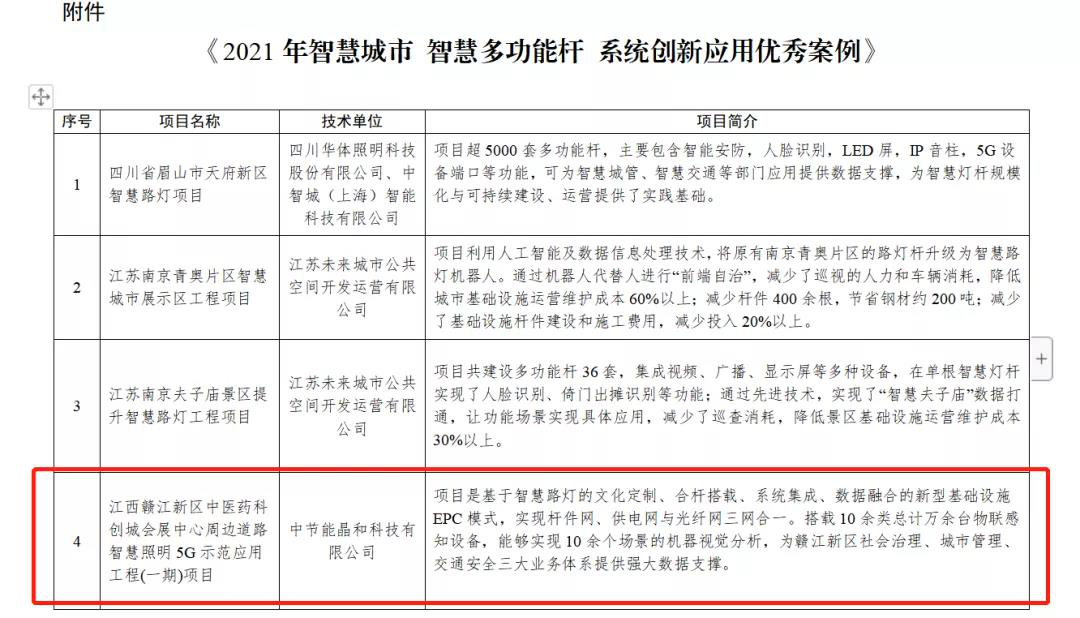 12月8日,國(guó)家節(jié)能中心官網(wǎng)發(fā)布《2021年智慧城市 智慧多功能桿 系統(tǒng)創(chuàng)新應(yīng)用優(yōu)秀案例》,江西公司下屬子公司中節(jié)能晶和科技有限公司“江西省贛江新區(qū)中醫(yī)藥科創(chuàng)城會(huì)展中心周邊道路智慧照明5G示范應(yīng)用工程(一期)項(xiàng)目”,經(jīng)國(guó)家節(jié)能中心專家評(píng)價(jià)篩選,結(jié)合實(shí)地考察結(jié)果,專家組終審確認(rèn)成功入選。此次國(guó)家節(jié)能中心經(jīng)過(guò)現(xiàn)場(chǎng)核實(shí)、情況復(fù)查、信譽(yù)核查及公示等環(huán)節(jié)僅評(píng)選出10個(gè)符合標(biāo)準(zhǔn)的優(yōu)秀案例。