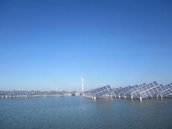 2011年12月30日,中節(jié)能江蘇東臺(tái)78.8兆瓦灘涂光伏發(fā)電項(xiàng)目并網(wǎng)發(fā)電,是當(dāng)時(shí)國內(nèi)規(guī)模最大的灘涂電站,僅用了80余天完成建設(shè)。該項(xiàng)目利用國華公司40萬千瓦陸上風(fēng)電下面閑置的2100畝灘涂,形成上有風(fēng)電、中有太陽能發(fā)電、下有水面養(yǎng)殖的“風(fēng)光漁”三合一綜合利用模式,起到良好的示范作用。
