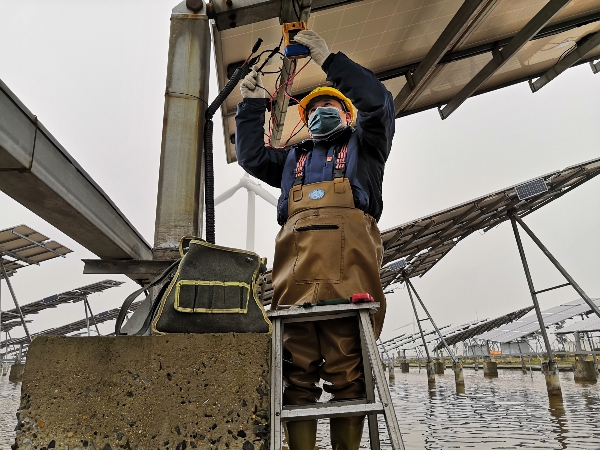 太陽能華東區(qū)東臺電站坐落于黃海之濱,三十五萬塊太陽能電池板占據(jù)了這兩千六百畝的海面,彷如海岸邊的“書頁”,記錄著這座電站的事和人。而它們的“第一頁”記載著一名叫做劉加勇的漢子。 2011年,東臺電站成立之初,國家要求電站一期二期項目年底完成并網(wǎng),如果不及時完成那么公司將會因電價補貼減少損失兩千多萬,而距離這最后期限只剩三個月。時任東臺電站運行部值班長的劉加勇充分發(fā)揚黨員精神,“臨危請命”,首先協(xié)助團隊辦理各類手續(xù)資料,保證電站手續(xù)的不出差錯,之后電站進入消缺階段,小至太陽板的螺絲加裝平墊和彈墊,大至箱變高壓側絕緣加強解決放電事故,他都能以較好的專業(yè)知識在現(xiàn)場給予指導,配合總包方提前完成了消缺工作。茫茫的海面上,無數(shù)太陽能板在烈日下映射著劉加勇面朝海水背浸濕的身影,抬頭是密密麻麻的“森林”,俯身是暴曬潮濕的水面。連續(xù)三個月劉加勇夜以繼日地檢查每一塊發(fā)電板,保證每一個板塊的正常運行,全力投入這場與時間的爭奪戰(zhàn)中,最終東臺電站順利在年底完成并網(wǎng)。