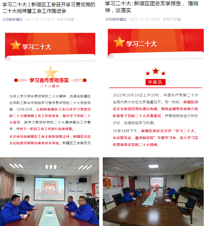 新疆區(qū)黨總支堅決做到高起點謀劃、高質量推進、高標準貫徹,認真落實歸口意識,對照集團公司、太陽能公司黨委深入學習宣傳貫徹黨的二十大精神方案要求,依托愛黨愛國愛企學習教育活動,開展“貫徹黨的二十大·閱享新征程”、“禮贊新時代·奮進新征程”、“我和家人一起感悟二十大”、“二十大快問快答”“我把黨的二十大講給你聽”“曬曬二十大學習筆記”等系列活動,切實把學習宣傳貫徹黨的二十大精神和“科技創(chuàng)新年”、推動“三新兩保一推進”目標任務結合起來,忠實踐行讓天更藍,讓水更清,讓世界更美好的愿景,全方位、多角度地展示大區(qū)工作成效,以防風險、保安全、護穩(wěn)定、促發(fā)展的新成效為中國式現(xiàn)代化建設貢獻力量。