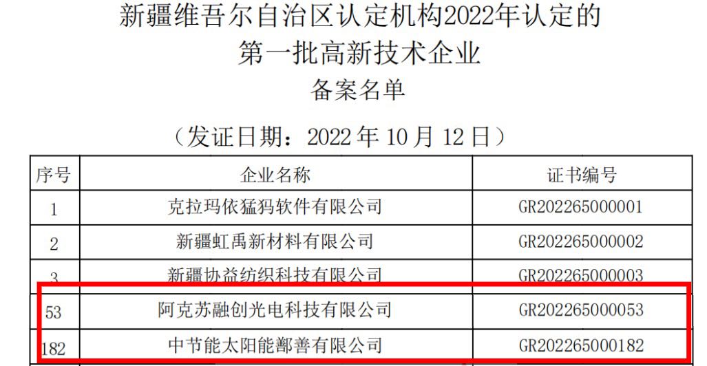 近日,全國高新技術(shù)企業(yè)認定管理工作領(lǐng)導(dǎo)小組辦公室發(fā)布了《新疆維吾爾自治區(qū)認定機構(gòu)2022年認定的第一批303家高新技術(shù)企業(yè)備案名單》,太陽能新疆區(qū)下屬中節(jié)能太陽能鄯善有限公司、阿克蘇融創(chuàng)光電科技有限公司2家公司被認定為2022年第一批國家高新技術(shù)企業(yè)。