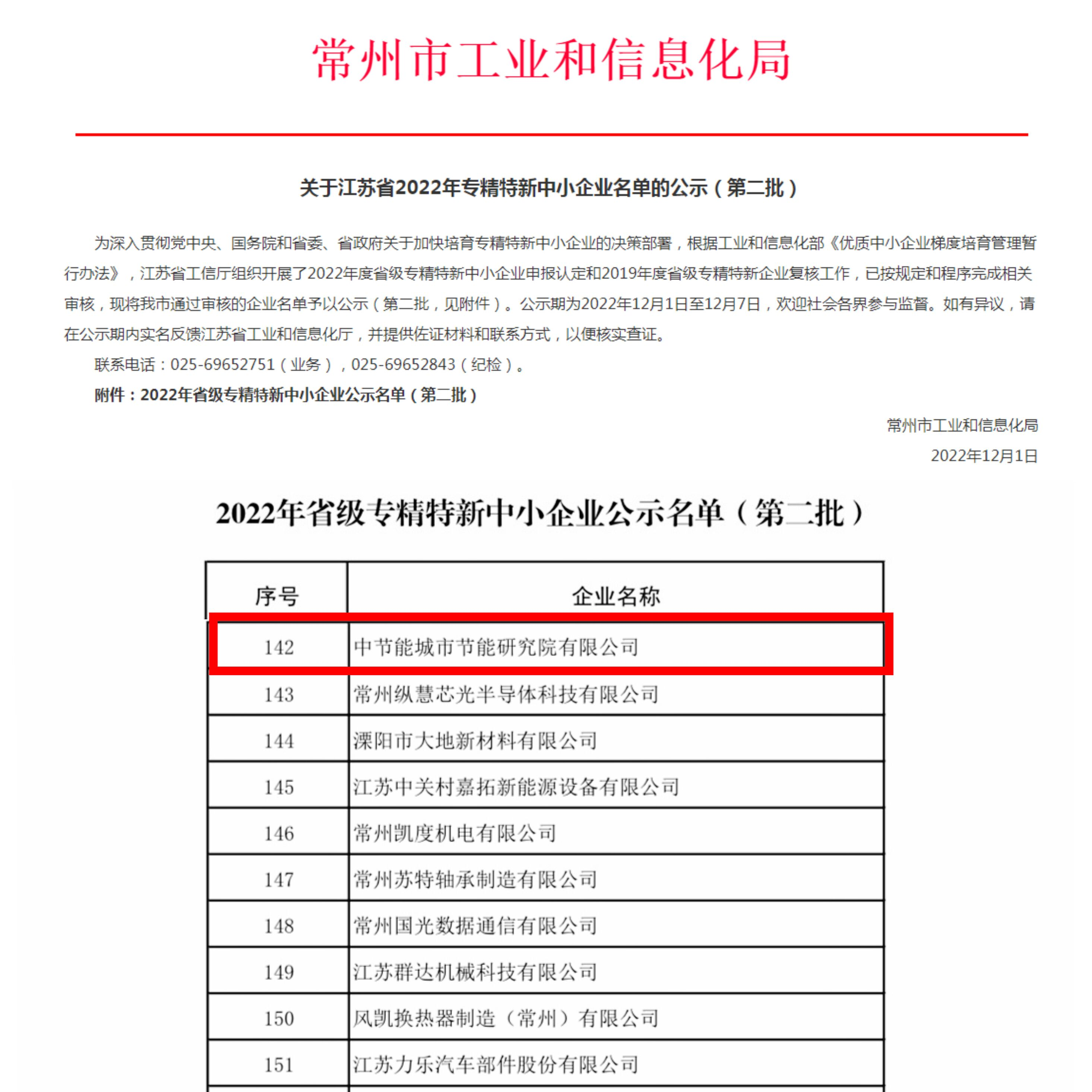 12月1日,江蘇省工信廳完成2022年度省級(jí)專精特新中小企業(yè)認(rèn)定,中節(jié)能城市節(jié)能研究院有限公司成功入選“2022年江蘇省專精特新中小企業(yè)”。