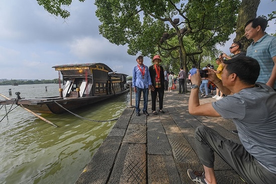 兩名老黨員在浙江嘉興南湖湖心島停泊的南湖紅船旁拍照留影(7月1日攝)。新華社記者 徐昱 攝