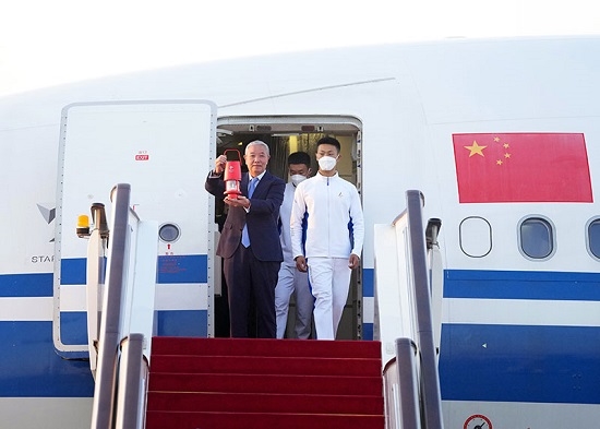 10月20日,在北京首都機(jī)場,北京冬奧組委特別代表、北京冬奧組委副主席于再清(左)手持火種燈走出艙門。隨著北京冬奧組委赴希臘代表團(tuán)抵達(dá)首都機(jī)場,北京冬奧會火種順利抵達(dá)北京。新華社記者 張晨霖 攝