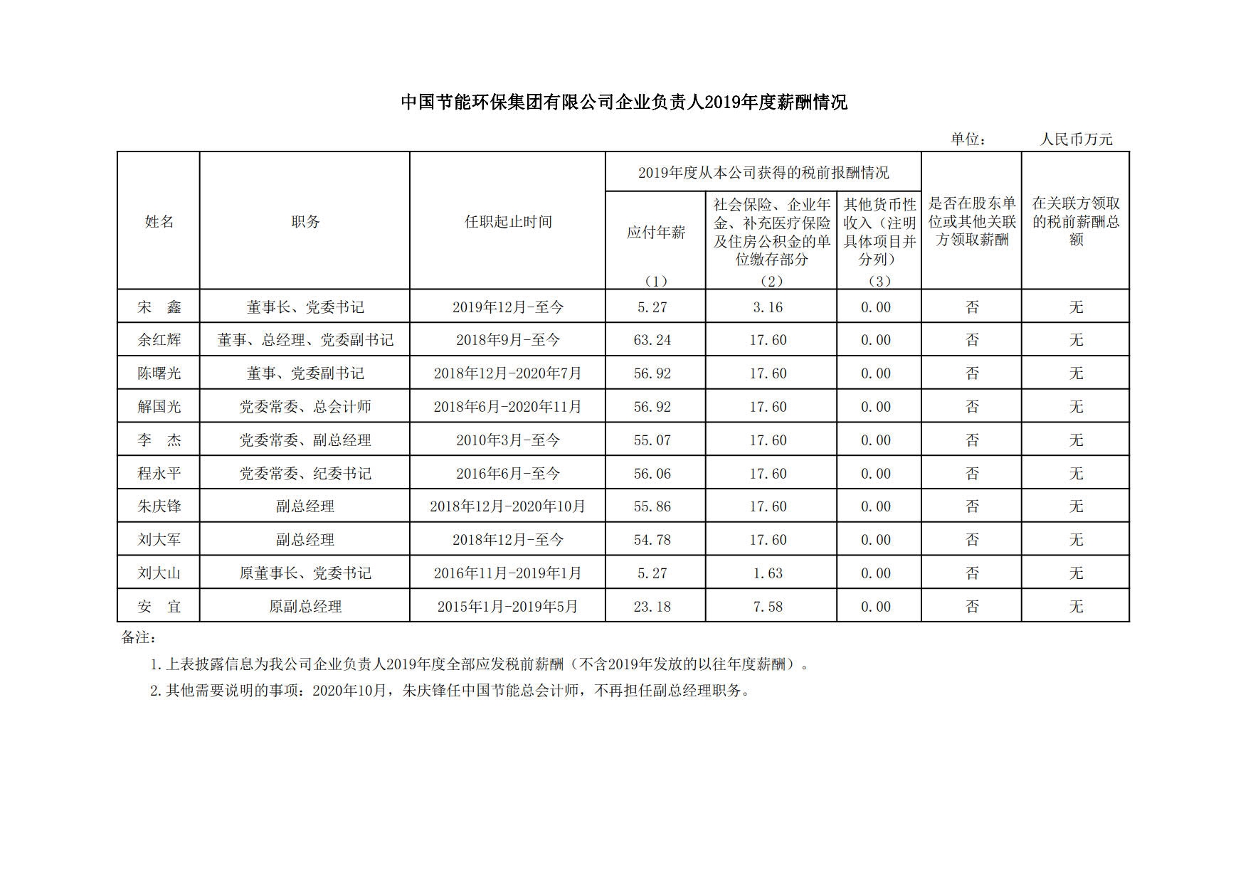 中國節(jié)能環(huán)保集團公司企業(yè)負責(zé)人2019年度薪酬情況